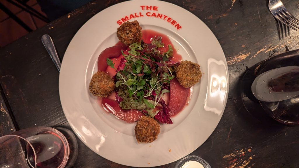 Taking my mum along with me, an avid food-lover herself, we were greeted with a snug ambiance and friendly waitress. Waiting for us was a gorgeous bread basket and a choice of three spreads, a sort of creamy red pepper relish, richly garlicky pesto and buttery aioli. A big win in my eyes. To start, we chose to share the duck croquettes with pickled quince as well as the leek and cheddar tart. The Small Canteen is a perfect example of ‘simple but effective.’ I don’t want you to get the wrong idea, however. The flavours of these starters were at the same level I have had at more snazzy establishments. The sweetly pickled quince paired with the rich, soft croquettes was a match made in heaven that never crossed my mind. The luxurious abundance of cheesiness within the tart was perfection and the sweet and sticky mystery additions on the plate, perhaps figs or prunes, left me deeply impressed. Both starters were dressed with micro-greens bringing it together as a great start to our meal.