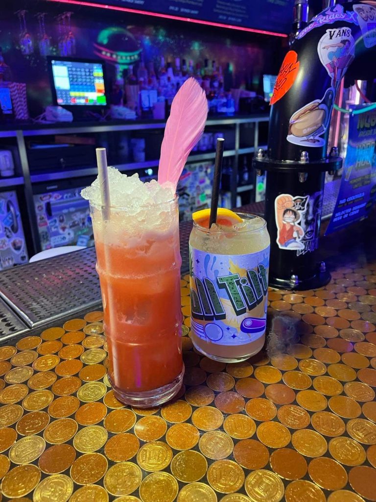 Lastly, we were treated to the most popular cocktail on the menu, the ‘Aku Aku Fruit Punch’. Obsessed with the neon feather that glows in the dark with the interior of the bar, this cocktail was reminiscent of foamy bananas (if you know, you know) and accompanied Ell to her win at the pinball machine.